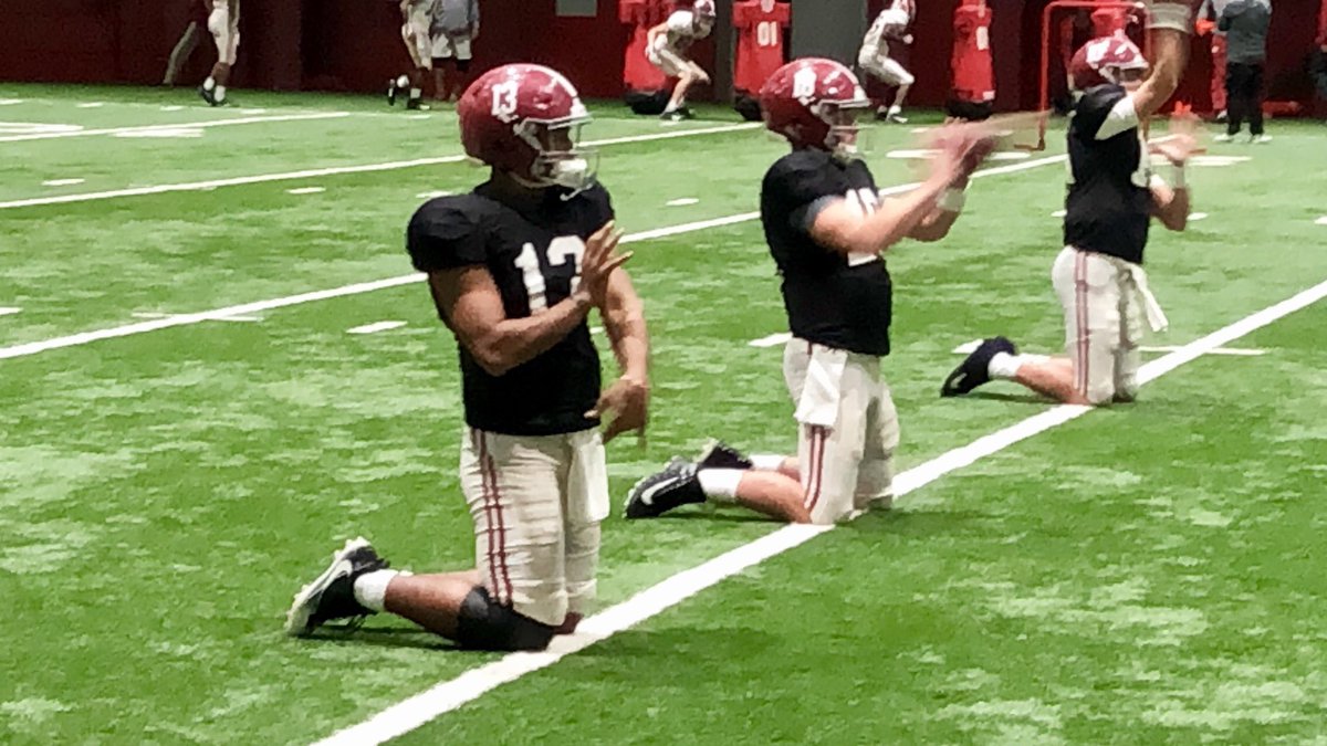 -- Quarterback Tua Tagovailoa (knee) was not wearing the familiar brace on his right knee. Instead, he only had a sleeve on his right leg and was once again not limited. Earlier in the day on the SEC teleconference, Nick Saban said he thinks Tagovailoa is over his earlier knee injury.