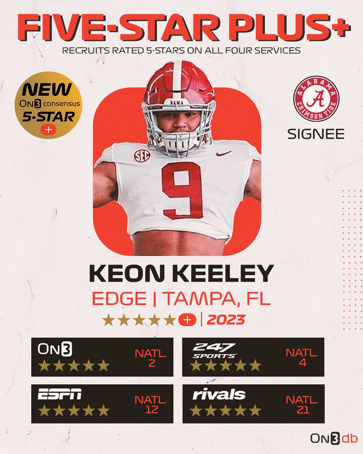 Out of 10, Bama now has 3 5-star+ players in the 2023 class - Keon Keeley; Caleb Downs; Kadyn Proctor. LINK