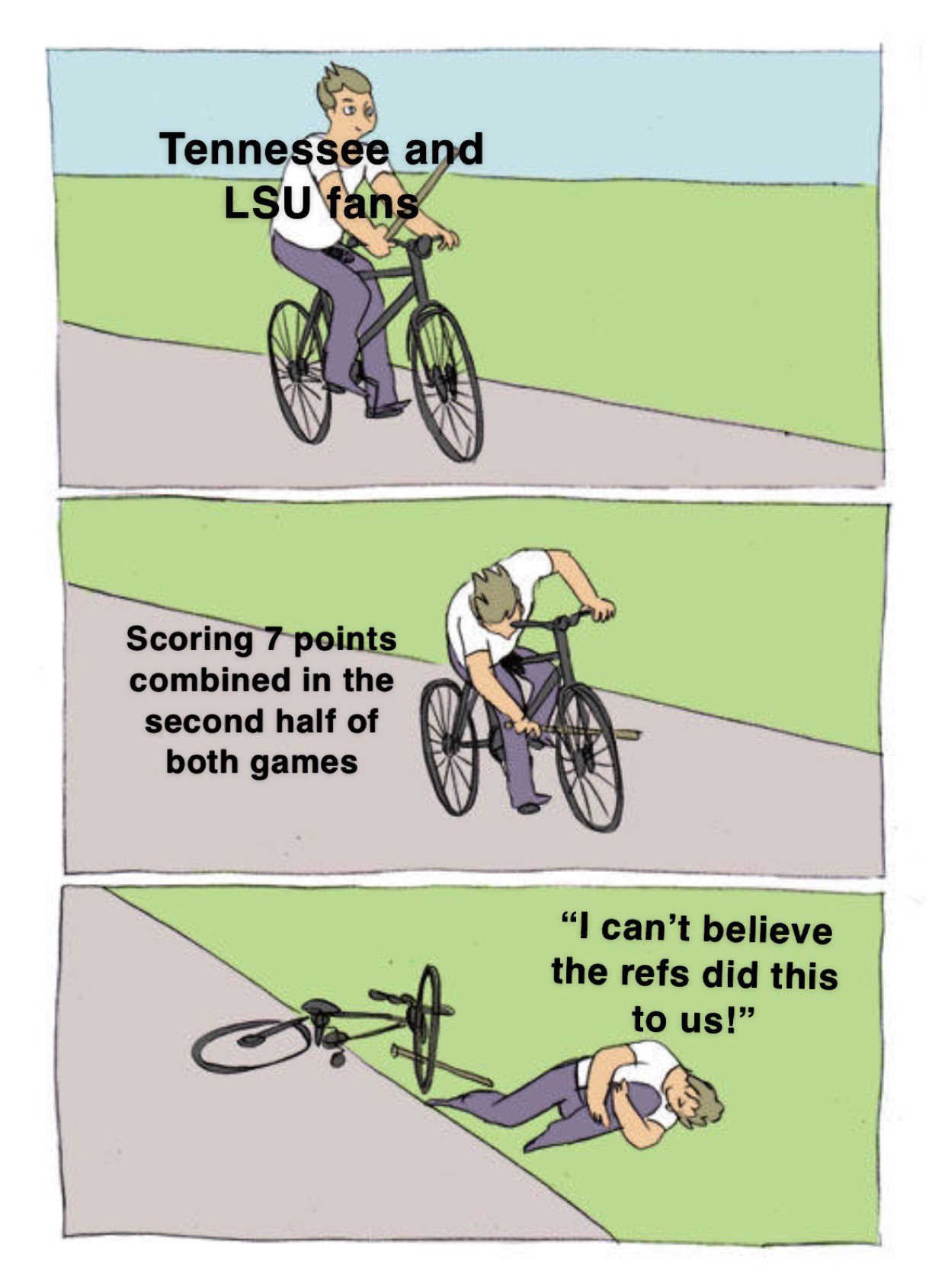 Every fanbase complains about refs, but LSU fans are by the worst. It’s not just a bad call or two, they take it to another level and start with the conspiracy crap. They’ll blame the conference, the conference location, scheduling, etc. It’s all a massive behind the scenes movement to suppress LSU and help Bama. No win of our’s is legitimate because we were given it.