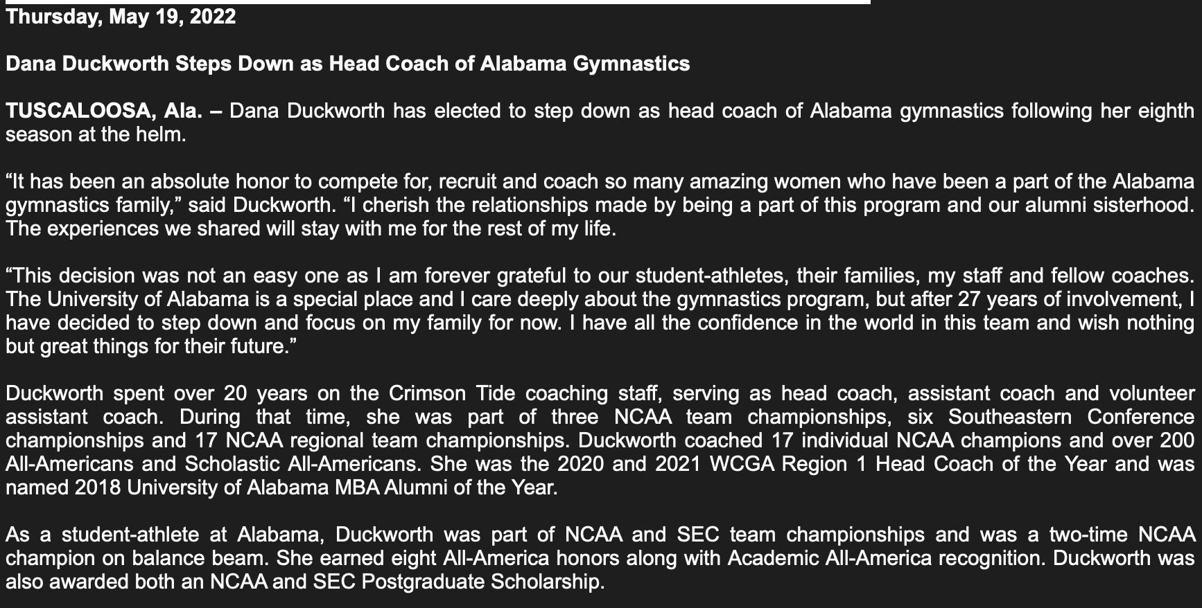 "We appreciate Coach Duckworth's contributions to Alabama gymnastics, both as a coach and a student-athlete," said Alabama Director of Athletics Greg Byrne. "She has had a lot of success over the years as a coach and as a leader in the community, and we wish Dana and her family all the best going forward."