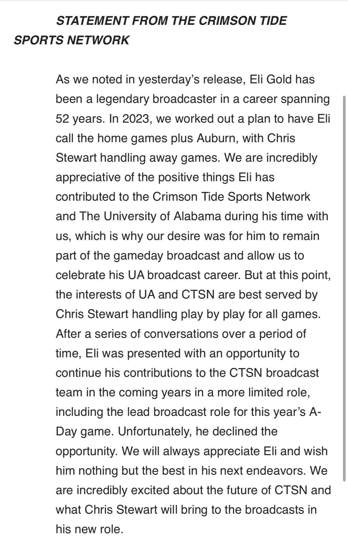 Eli on Fox 6 right now complaining about being replaced. He said that they offered A-Day to him but they wanted him to sign an NDA so he wouldn’t bash the school. He said he wasn’t comfortable with that so they took A-Day away.