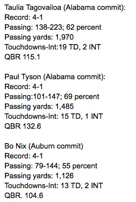 Update on Alabama's top three prep QB prospects halfway through the regular season...Paul Tyson (Paul "Bear" Bryant's great-grandson) is the only QB of the three with a victory against Hoover.