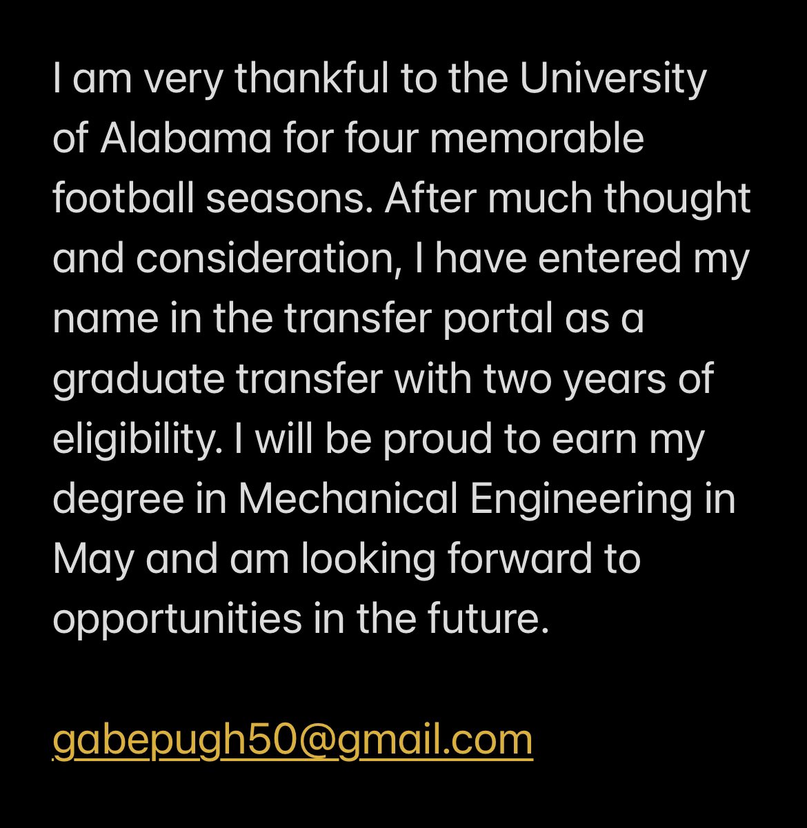 Pugh is the second walk-on to enter the transfer portal and is the 15th Alabama player to enter the transfer portal this year, joining Javion Cohen, Christian Leary, Aaron Anderson, Amari Kight, JoJo Earle, Tommy Brockermeyer, Jacoby Boykins, Khyree Jackson, Traeshon Holden, Jack Martin, Trey Sanders, Tanner Bowles, Damieon George, and Braylen Ingraham.