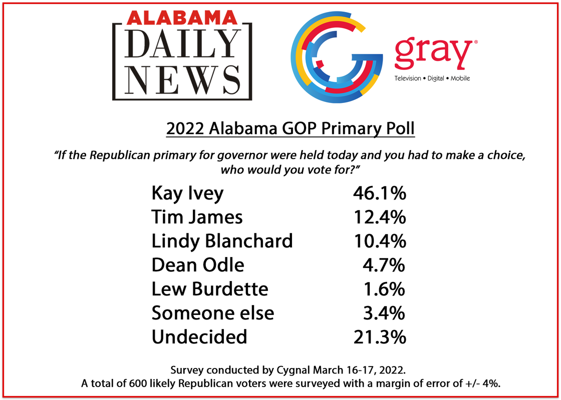 New poll in the race. I'm thinking Ivey being below 50% like this is something to watch. She's going to play it safe while others attack her, so she's not going to be gaining a ton of new votes. Still likely to win but a runoff where she can't run and hide would certainly be interesting.
