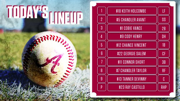 On mound today for Alabama is Sr right hander @ray_bay25 (0-0, 0.00 ERA). Ray is making his 2nd start of season, opponents hitting just .182