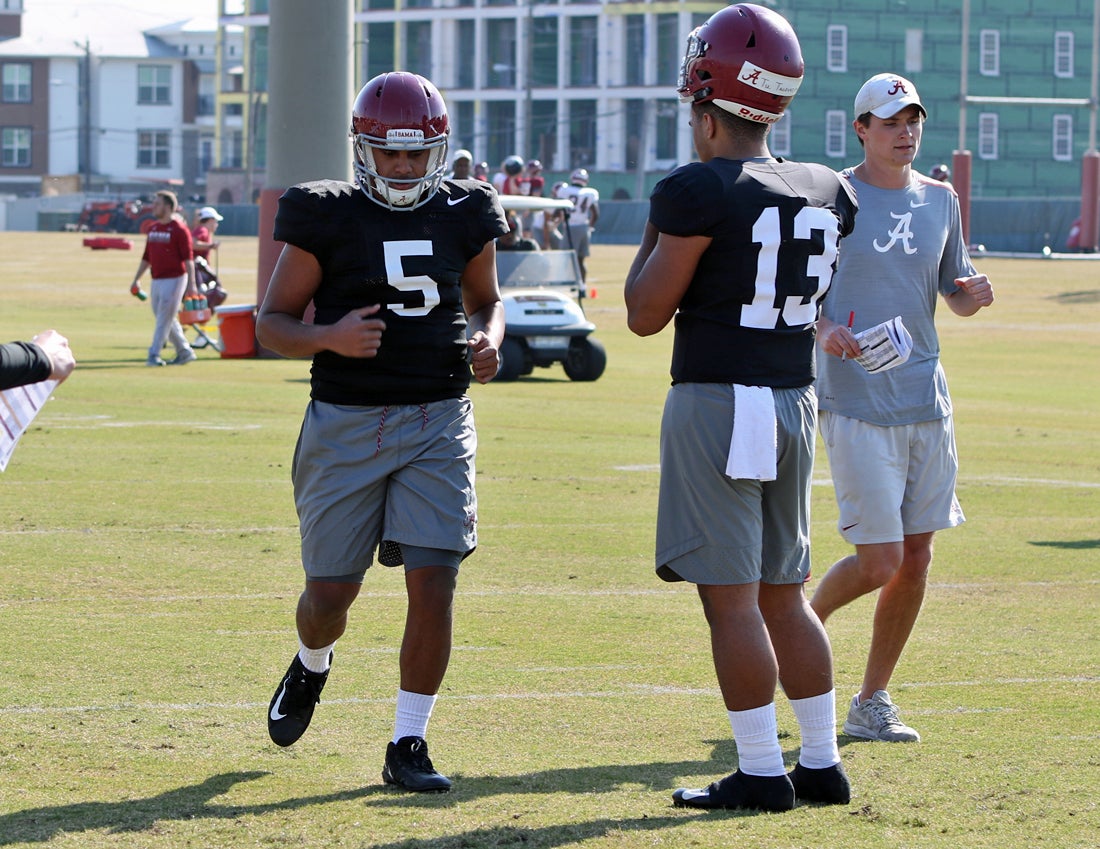 — The Tide split up its defensive backs during a drill. On one side, cornerback Trevon Diggs worked with safety Jared Mayden. On another, Patrick Surtain and safety Xavier McKinney went through their steps.