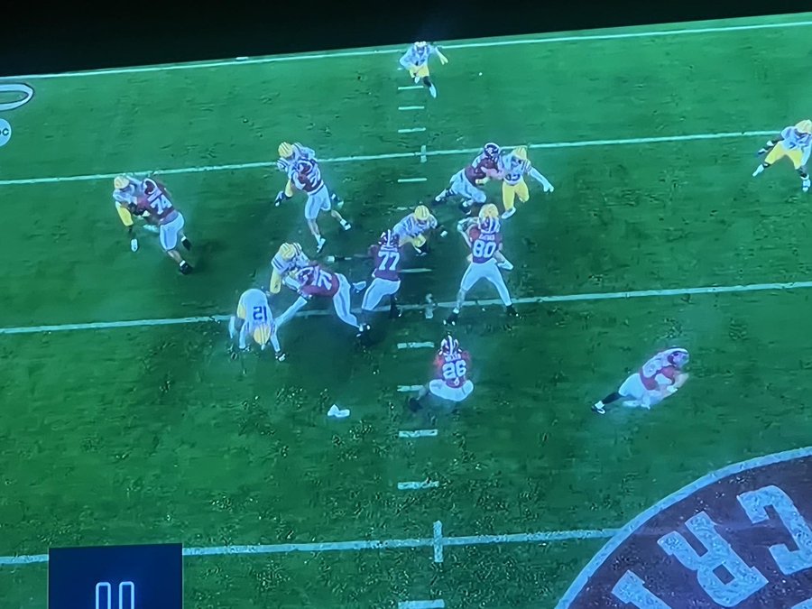 - - I think 74 should have either engaged, or at least chipped, LSUs right-side DE/Edge (on the double team the LG was dealing with). If you engage him, you handle the LSU DE at least, and maybe get to the second level to engage the DB that Proctor initially went after right out of the gate. If you don’t get to the block on the DB here, at least the RB has to make only him miss. If Proctor’s main assignment was the DB coming up, at least chip the LSU Edge defender hard as shite and knock him on his arse (as he was already off balance from the snap and even ended up stumbling once he got to Dewberry) so the LG can neutralize the DT like he was initially doing rather than worry about handling the double team.