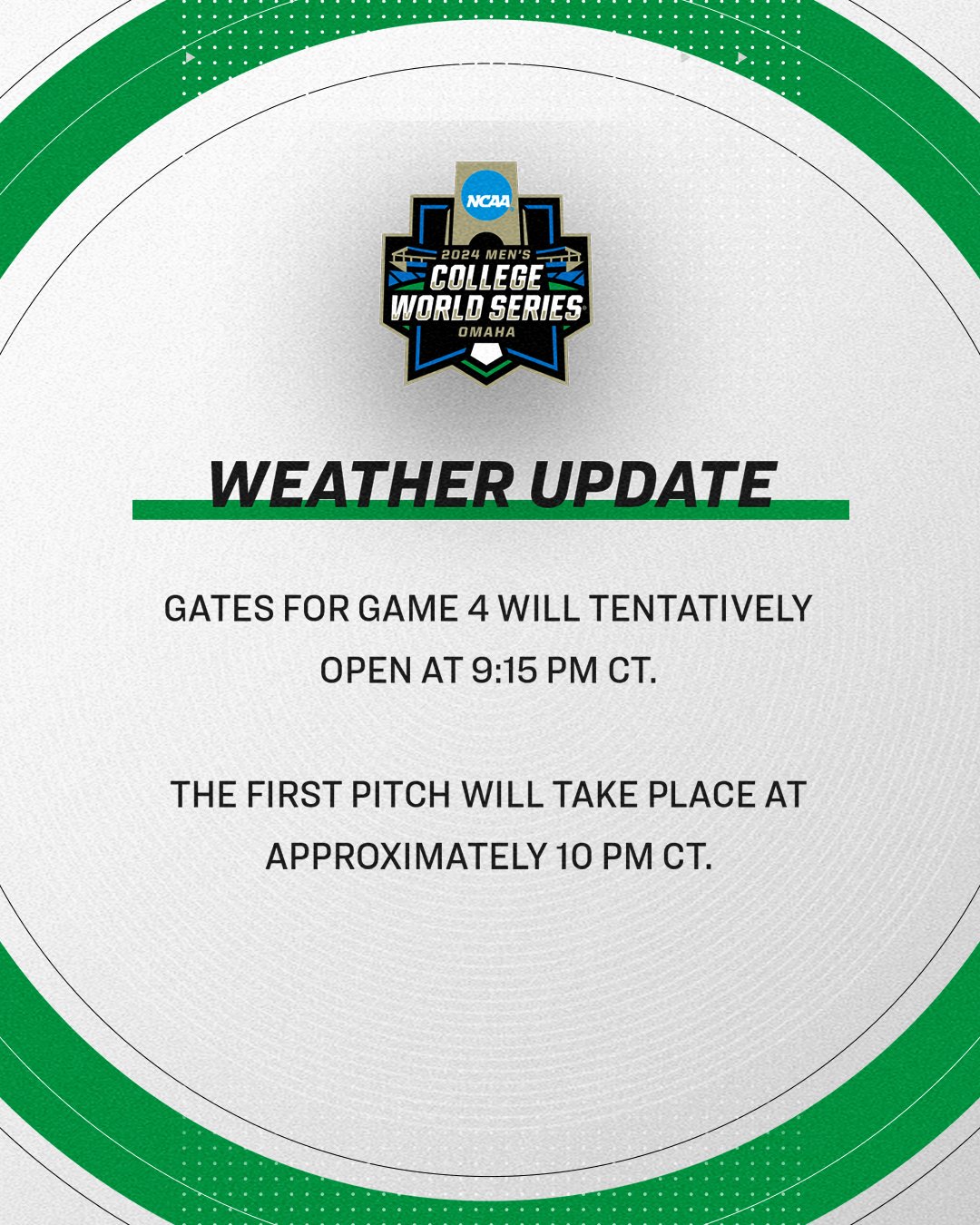 Due to potential weather, we will not be opening gates and delaying the start of Game 4. More updates to follow.
