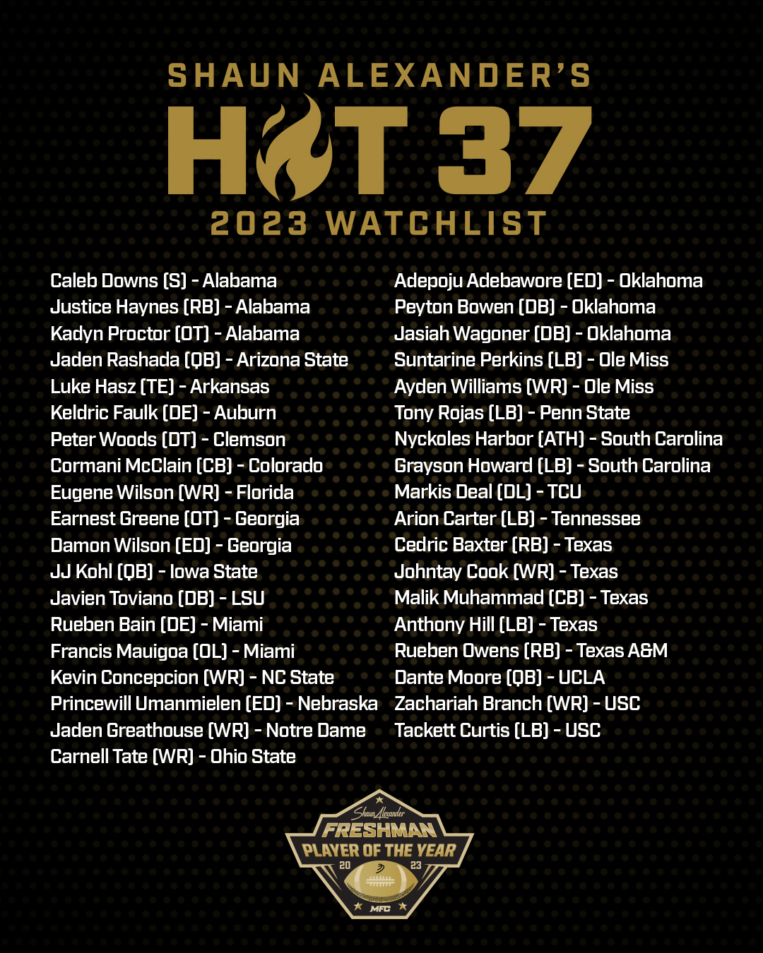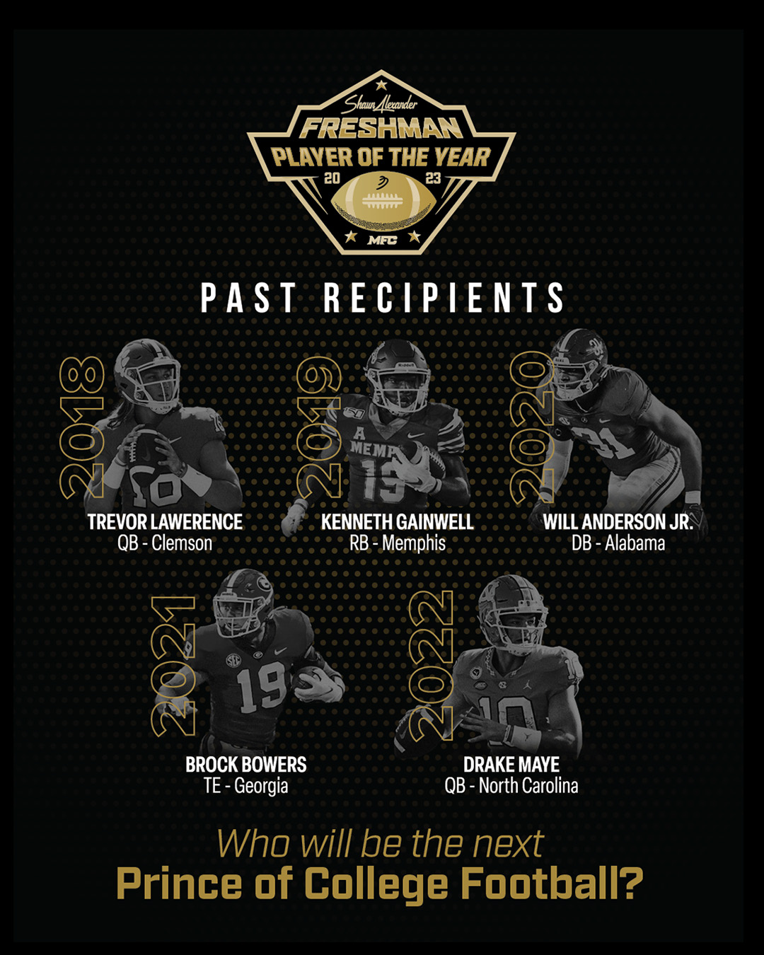 Since 2018, the Football Writers Association has partnered with Shaun Alexander to create the Freshman of the Year Award.