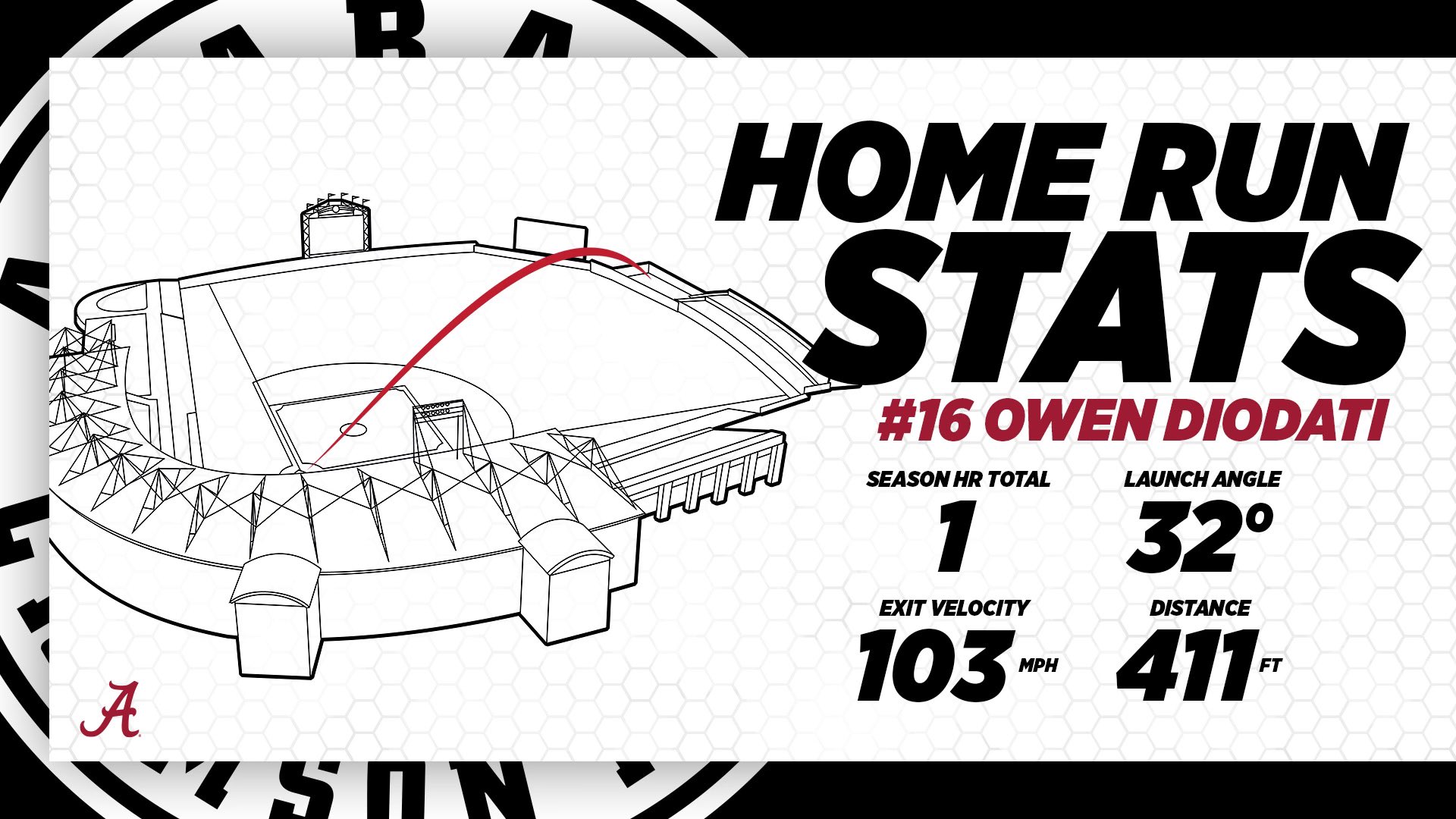Owen Diodati walked it off for UA on a two-run home run that capped a four-run ninth inning. The Tide trailed by three to start the ninth but a solo home run from Dominic Tamez to open the frame cut the lead to two. A double from Zane Denton put a runner on for William Hamiter, who followed with a double of his own to bring in Denton and make it a one-run ballgame. Diodati proceeded to hammer the first pitch he saw over the wall in right to send the Tide home victorious on Opening Day.