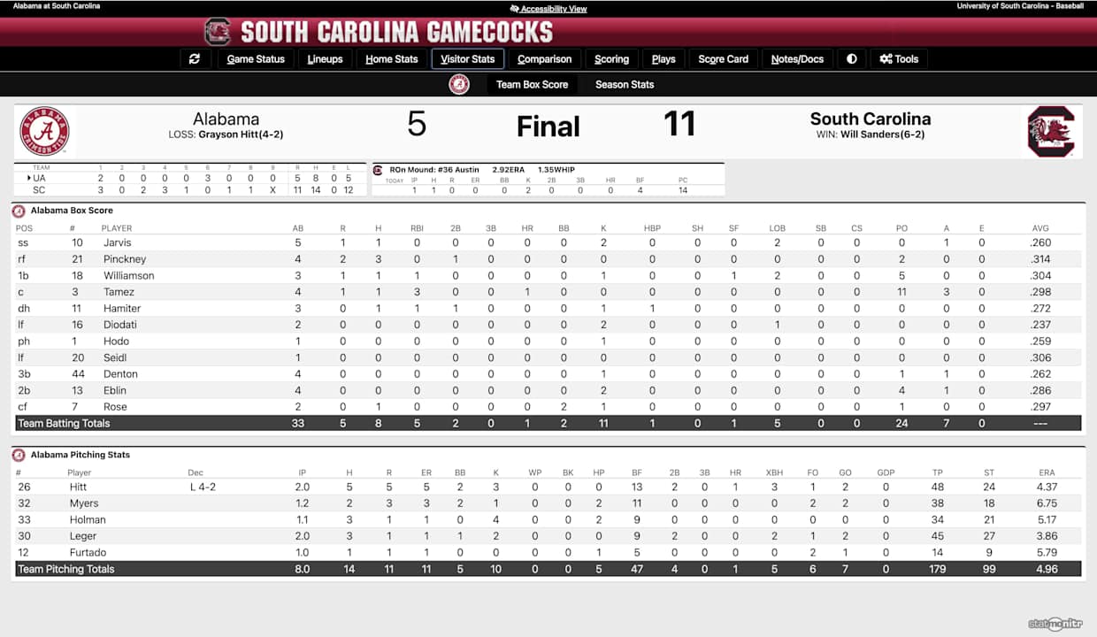 South Carolina starter Will Sanders (6-2) picked up the win, allowing five runs over 7.0 innings on Saturday. Grayson Hitt (4-2) suffered the loss for UA.