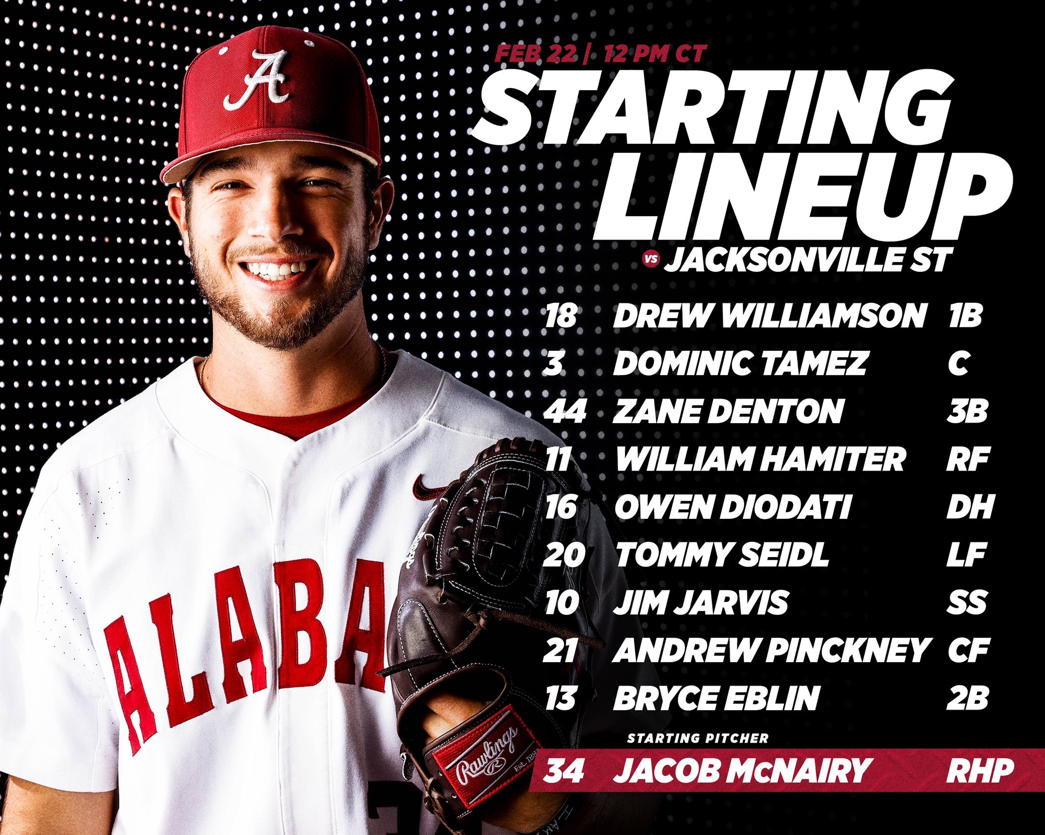 TUESDAY: UA – Jacob McNairy (Sr., RHP) vs. JSU – Jake Peppers (So., RHP)