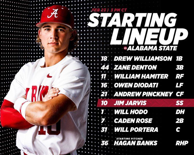 Will Hodo will be the designated hitter for the Crimson Tide and Will Portera will be behind the dish this afternoon.