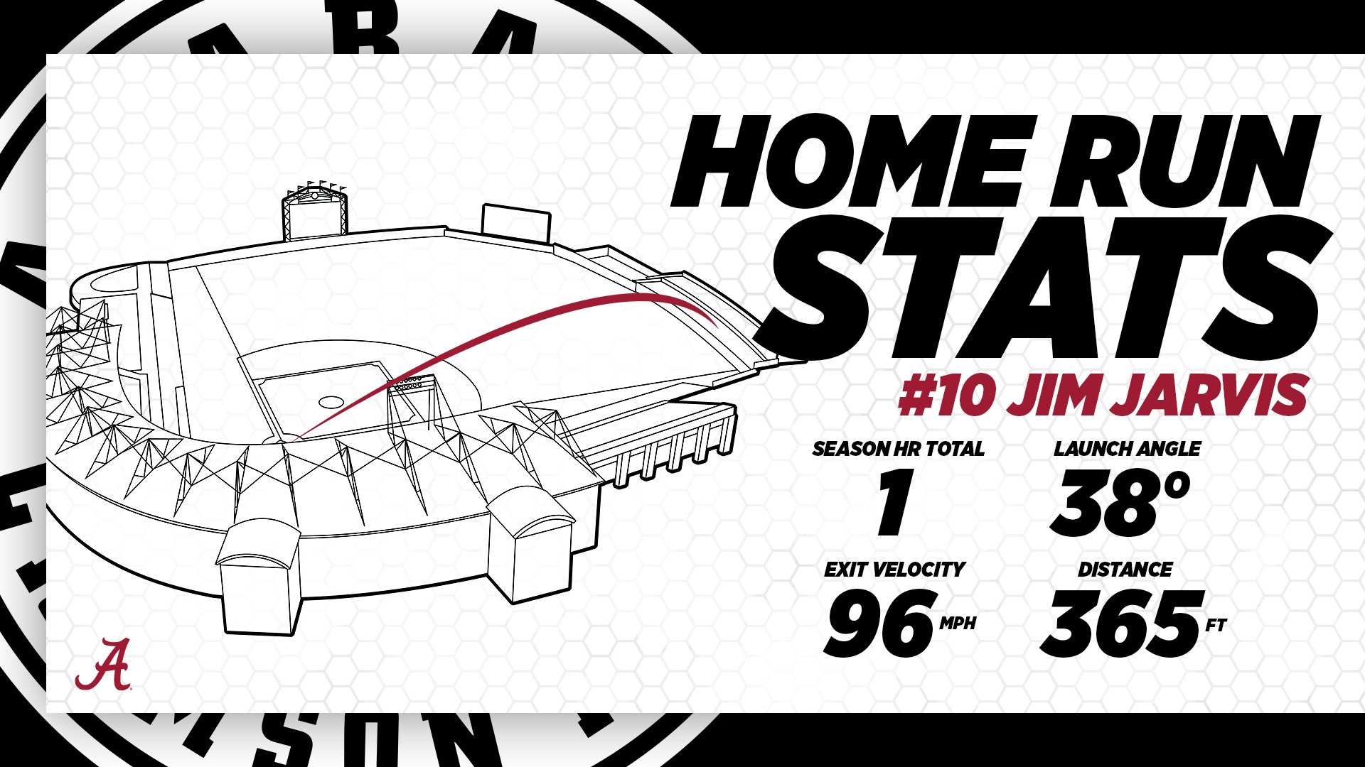Alabama combined for a season-high 14 hits and scored in five of the eight innings, posting two runs apiece in the second, third, sixth and seventh frames to go with a single tally in the fourth. The Crimson Tide was led offensively by Jim Jarvis. The junior shortstop finished 2-for-4, including his first career home, to go with a career-high three runs scored and team-high tying two RBI. Also homering in the game was Drew Williamson with the senior matching Jarvis in RBI and adding a run and a walk to his totals.