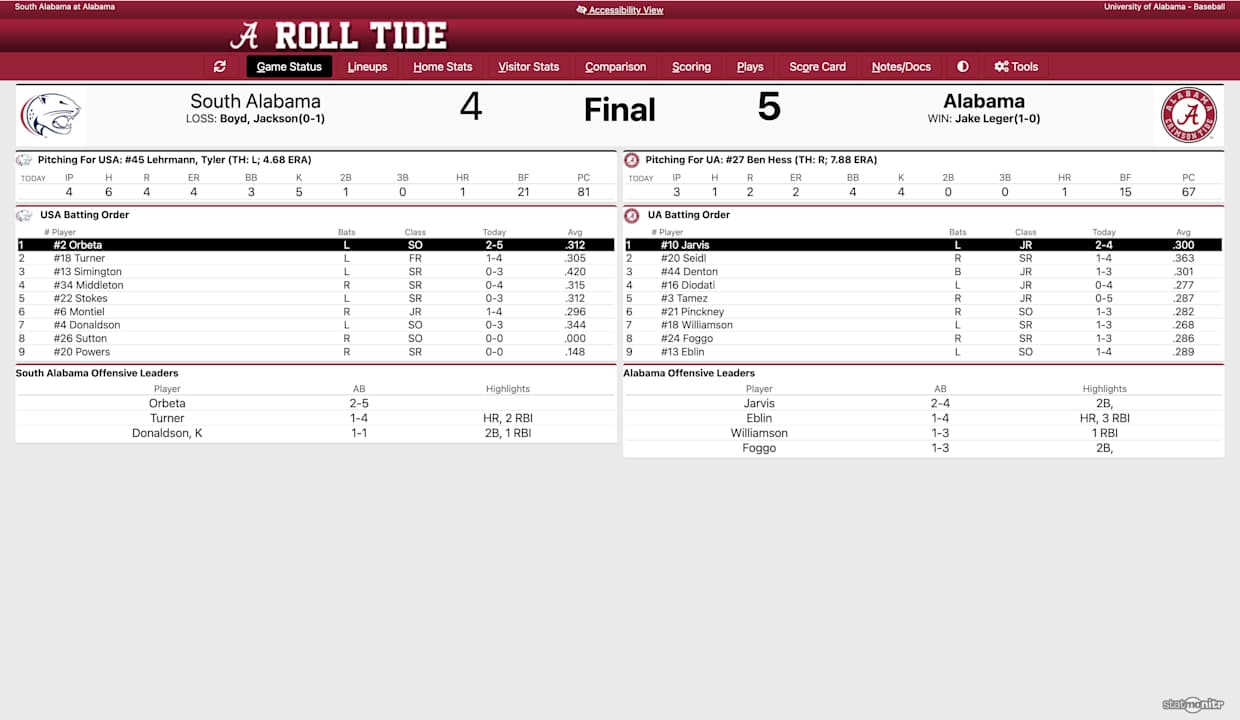 Jake Leger (1-0) was tabbed with the win on Tuesday night. The junior worked a scoreless ninth inning to earn his first win as a member of the Crimson Tide. South Alabama reliever Jackson Boyd (0-1) suffered the loss.