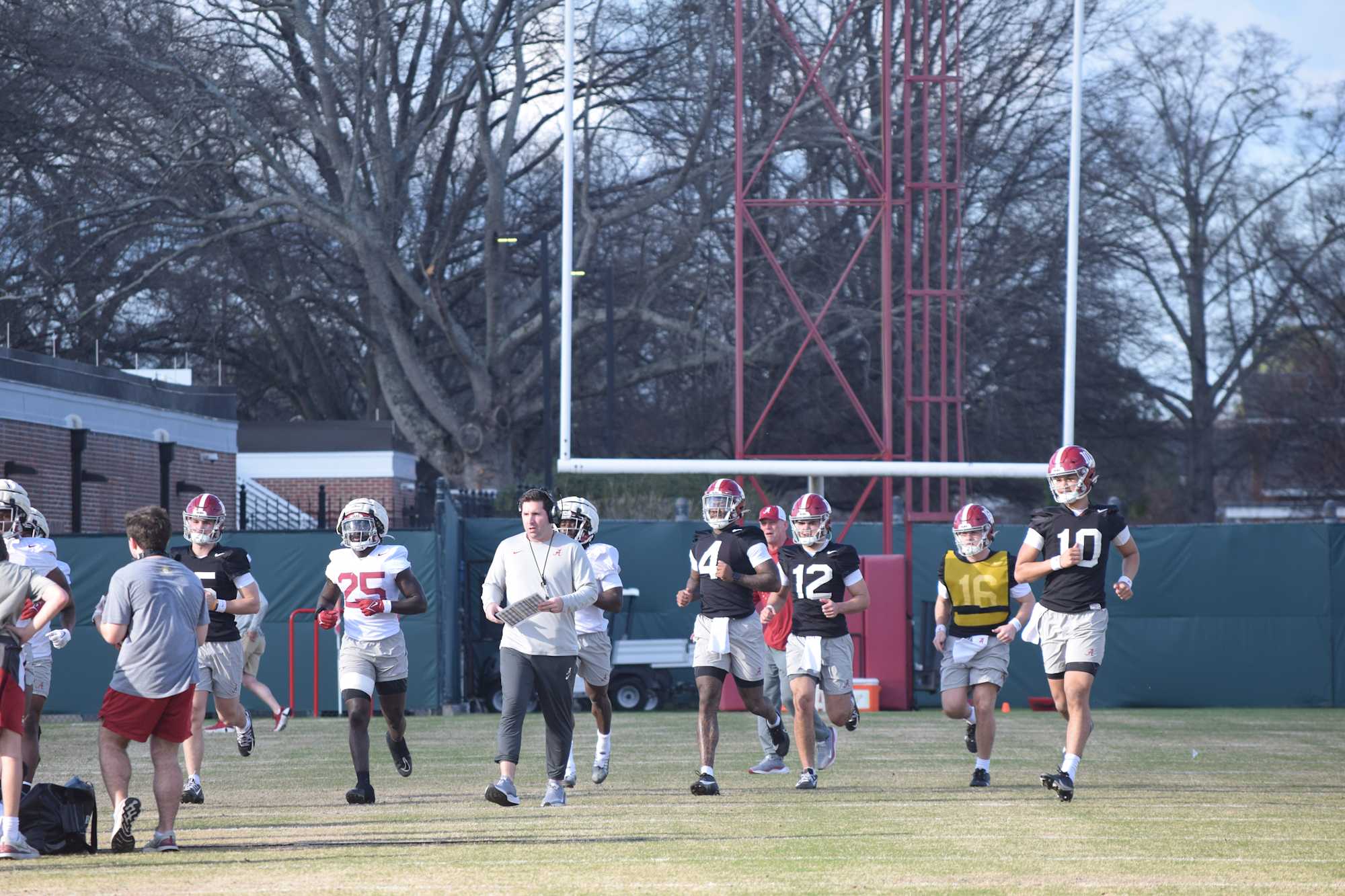 Quarterbacks- Returning starter Jalen Milroe was first in line for drills, followed by redshirt sophomore Ty Simpson, Washington transfer Austin Mack and redshirt freshman Dylan Longergan.