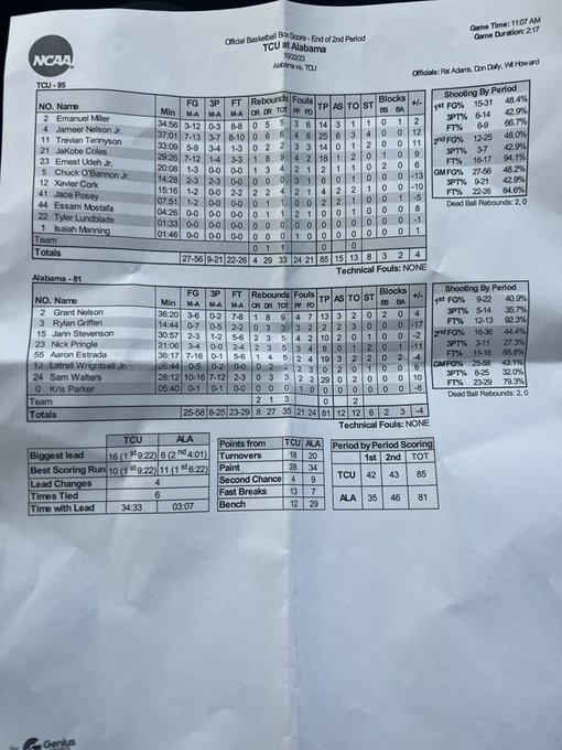 ~ We won a close rebounding battle 35-33. TCU actually had two more defensive rebounds than we did, but we had eight offensive rebounds to their four. Looks like the majority of their minutes we played by guys that go 6'2", 6'3", 6'7", 6'7", 6'8", 6'9" and 6'11".