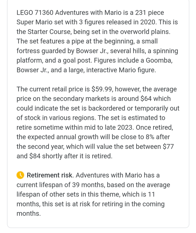 This is the lego set that is going to be my cash cow. Bought 10 mario sets of 17360 @ $25/each. Retail is $69.99 with it currently at $59.99. Will be worth around $80-100 once retired per set.