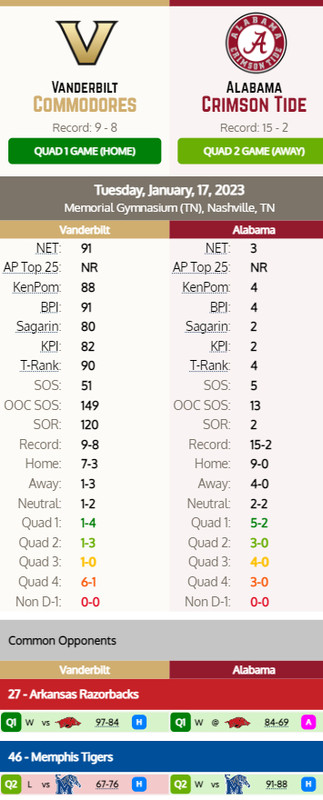 The Alabama-Vanderbilt matchup features two of the best shot blockers in the SEC, as Vandy's Liam Robbins ranks No. 2 in the conference with 2.9 blocks per game while Alabama's Charles Bediako's 1.9 blocks per contest ranks No. 4 in the SEC.