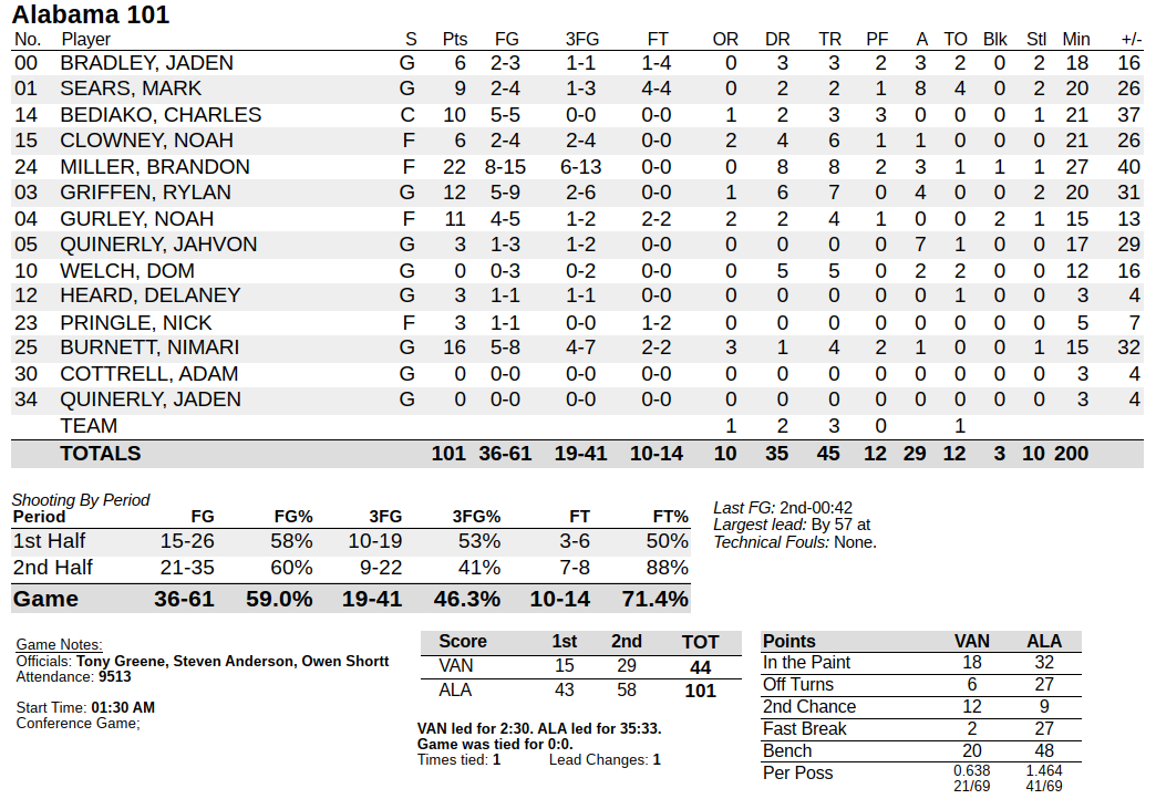 Oh what a night! Can’t remember where I heard it (and haven’t fact checked it) but heard that Bama has had 6 100+ point games in the 4 years since Oats arrived and the rest of the SEC has combined for 7 during that same span. The only ‘damper’ for me was the crowd was a bit underwhelming (including the students). Would have loved to have seen the place packed out, but I get that the tip off time, weather and life all get in the way. Incredible bounce back and am happy to have witnessed history in the making. Roll Tide!