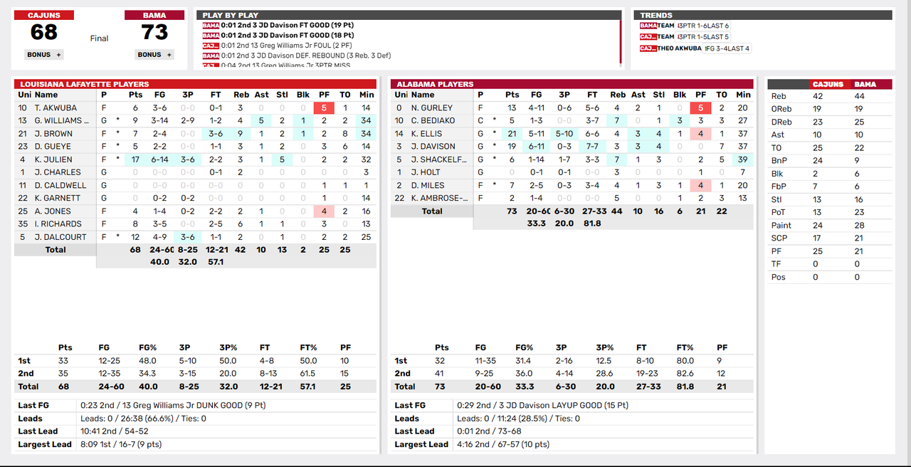 Senior guard Keon Ellis scored 16 of his game-high 21 points over the final 20 minutes of action to lead three Alabama players in double figures. Highly-touted freshman JD Davison scored 19 points and shared the team lead with Ellis with four steals. Meanwhile, graduate transfer Noah Gurley added 13 points before fouling out.