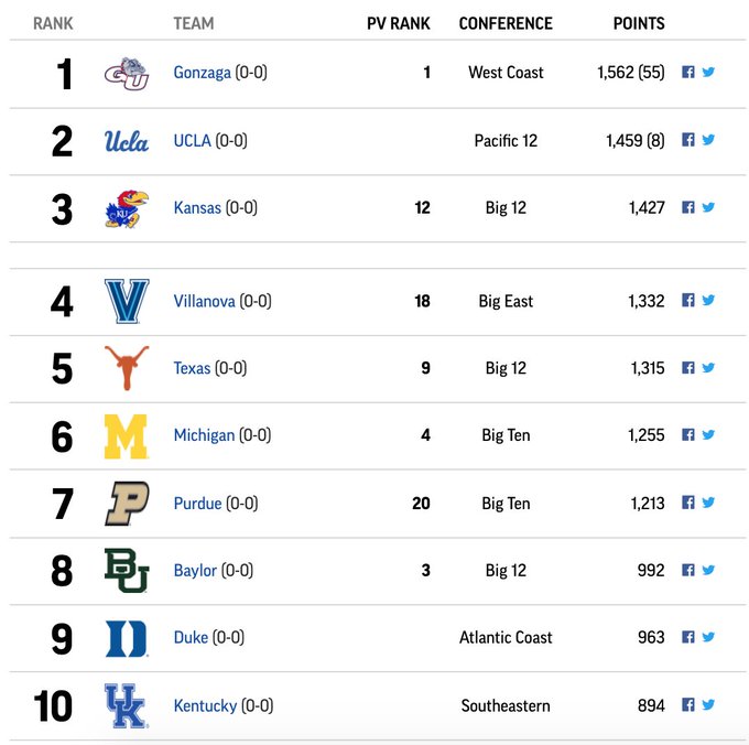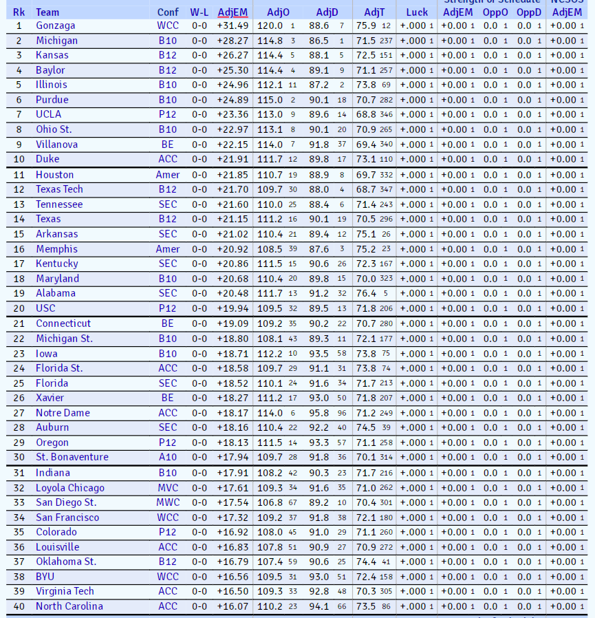KenPom 2021-22 preseason rankings/forecast published this morning. Here’s the top 40.