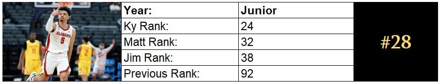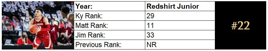 Turns out that a change of scenery CAN do wonders for some prospects (hey, just ask Quentin Grimes). Quinerly thrived in Nate Oats’ up-tempo attack, using his tremendous off-the-bounce creativity to knife into the gaps created by the Tide’s tidy spacing. The final month of his season was masterful, averaging 15.3 PPG and 3.8 APG on 50% shooting (46.5% from 3). With Herb Jones gone, he should slot in as the primary initiator, and his numbers could skyrocket.
