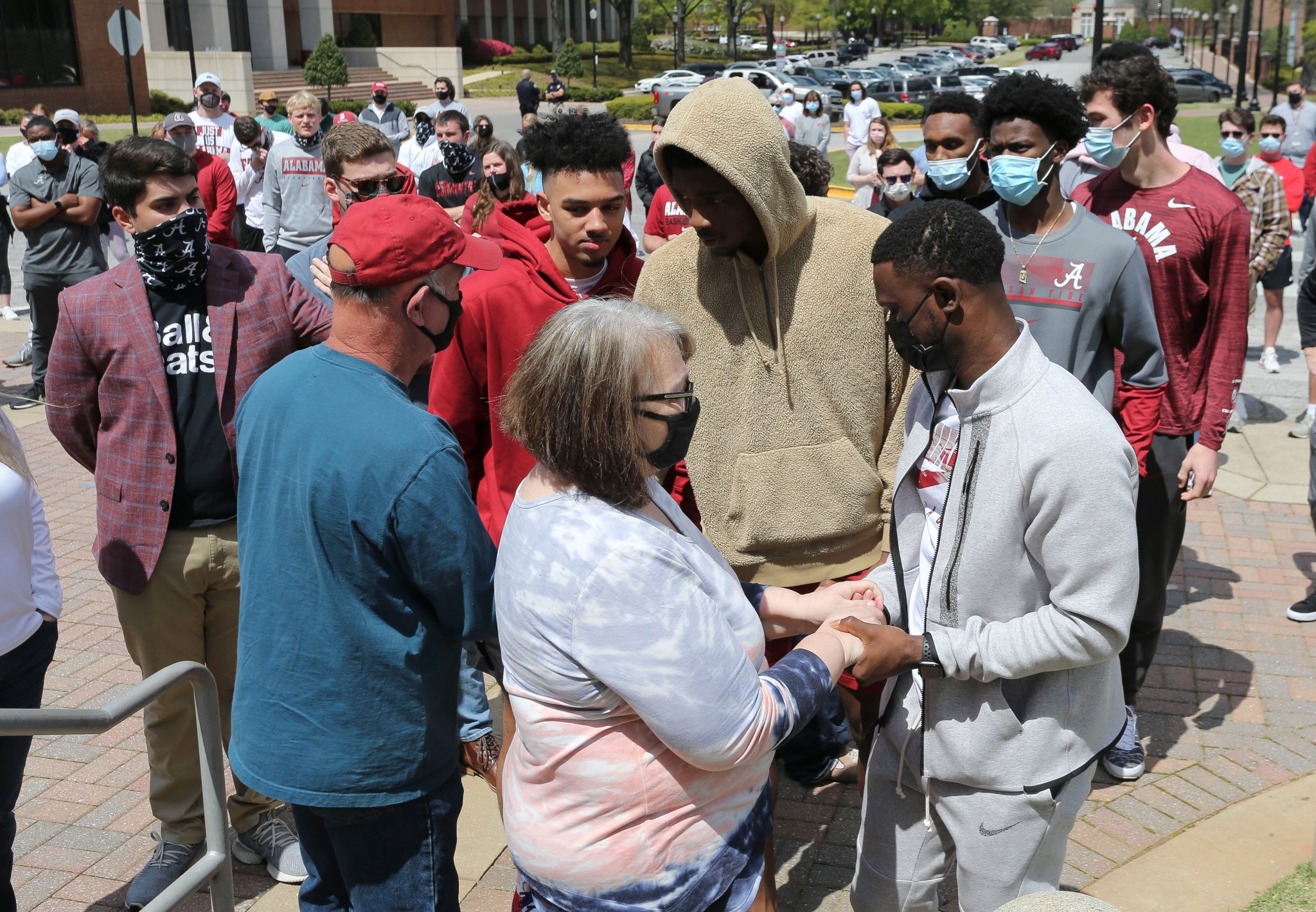 Alabama Basketball players speaking with Luke’s parents today at the gathering outside of Coleman Coliseum. Photo from the Tuscaloosa News.