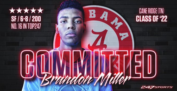 Alabama continues to roll on the recruiting trail under Nate Oats. Today, five-star small forward Brandon Miller became the latest prospect to end his recruitment in favor of the Crimson Tide.