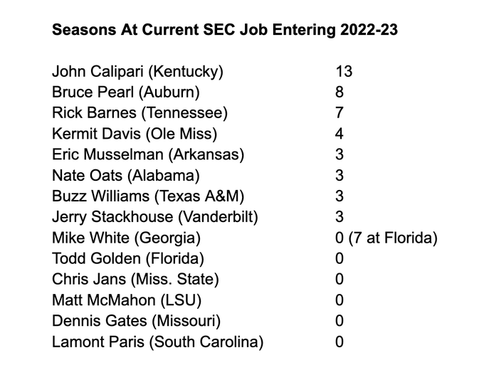 Here's a visual look at the coaching turnover in SEC basketball and the current hierarchy in years on the job. It's quite an overhaul based on where things were several seasons ago.
