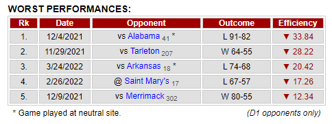 Gonzaga didn't care too much for the SEC this season. The SEC accounted for Gonzaga's worst and third-worst rated performances of 2021-22.
