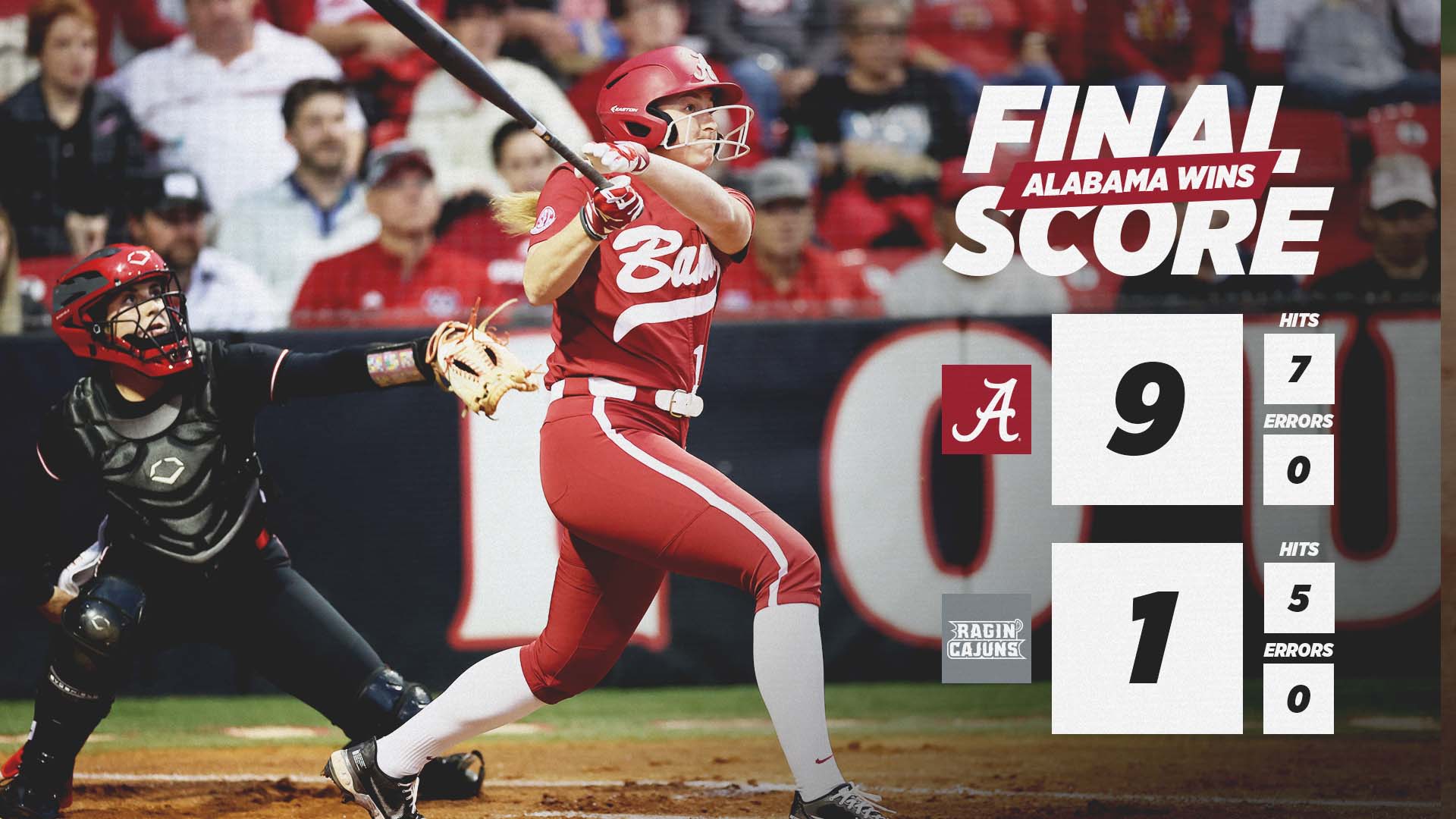 Alabama Softball Run-Rules Louisiana, 9-1, Thursday Night in Lafayette