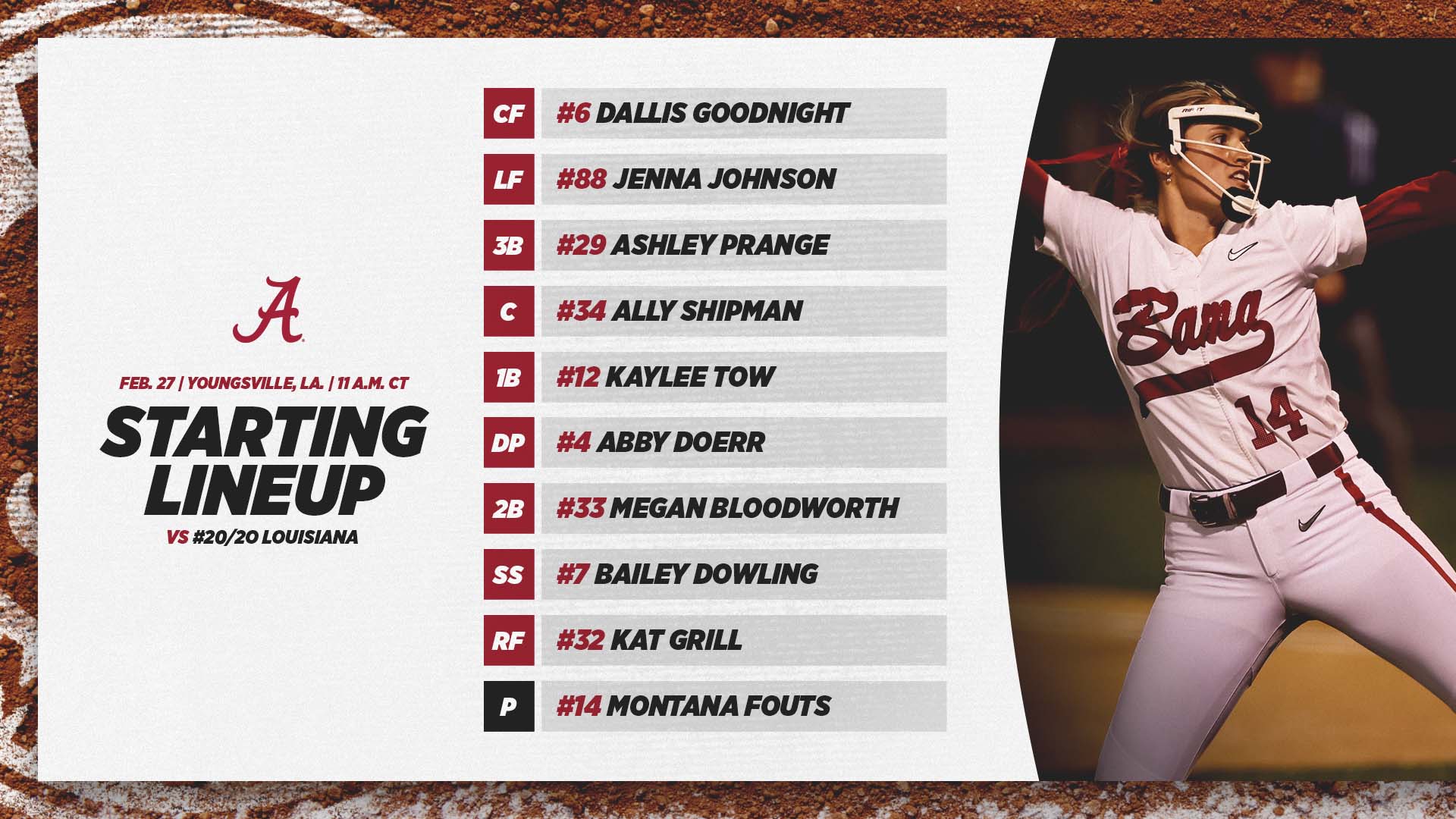 Alabama (14-0) scored eight runs in the first two innings against Northwestern State (8-5) and the Lady Demons were able to scratch across three runs in the third and fourth but the Crimson Tide pitchers and defense held them for the remainder of the game. In the nightcap, Alabama took a 1-0 lead in the second inning off a Louisiana Tech (8-6) error and got some insurance from a sixth-inning Ally Shipman home run, holding on for the two-run shutout.
