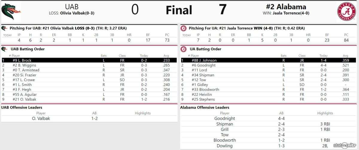 Alabama's (16-0) offense produced a season-high 13 hits against UAB (7-8), including multi-hit performances from Dallis Goodnight, Ally Shipman, Kaylee Tow and Kat Grill. Goodnight led the team with a 4-for-4 day at the plate, including her first career triple. Shipman drove in three RBIs, marking her team-leading eighth multi-RBI game of the season. Jaala Torrence (3-0) was dominant in the circle, shutting out the Blazers and limiting them to just two hits while striking out five.