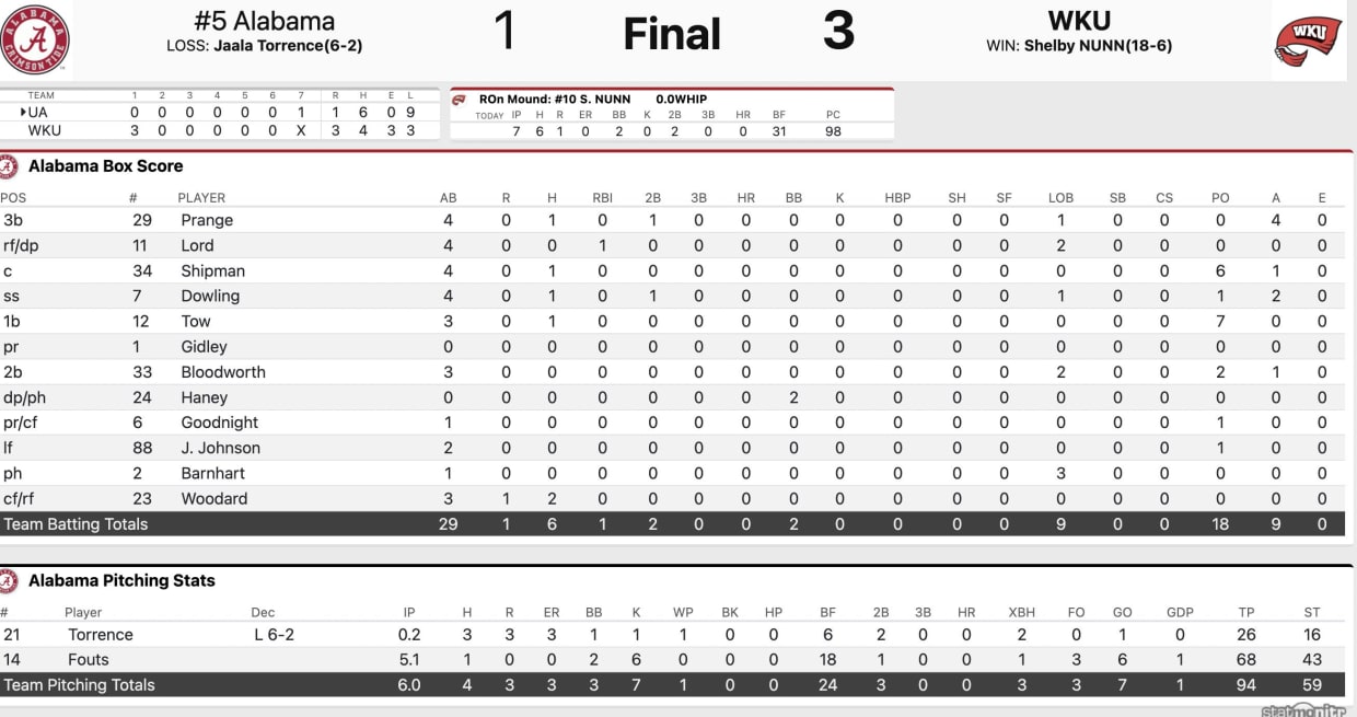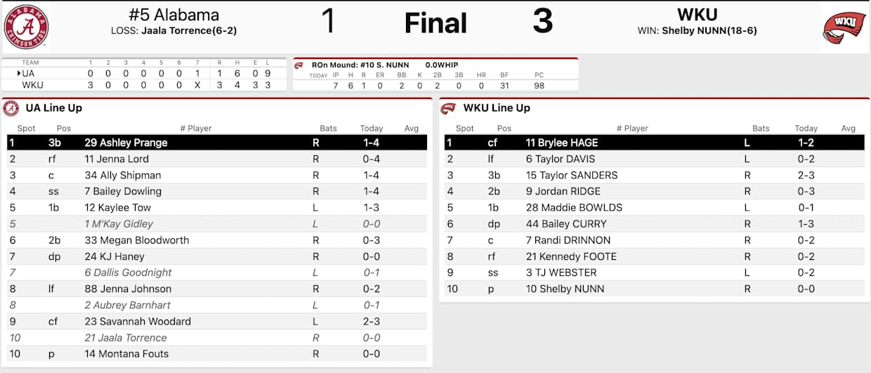 Alabama Softball Upset 3-1 by Western Kentucky (SI)
