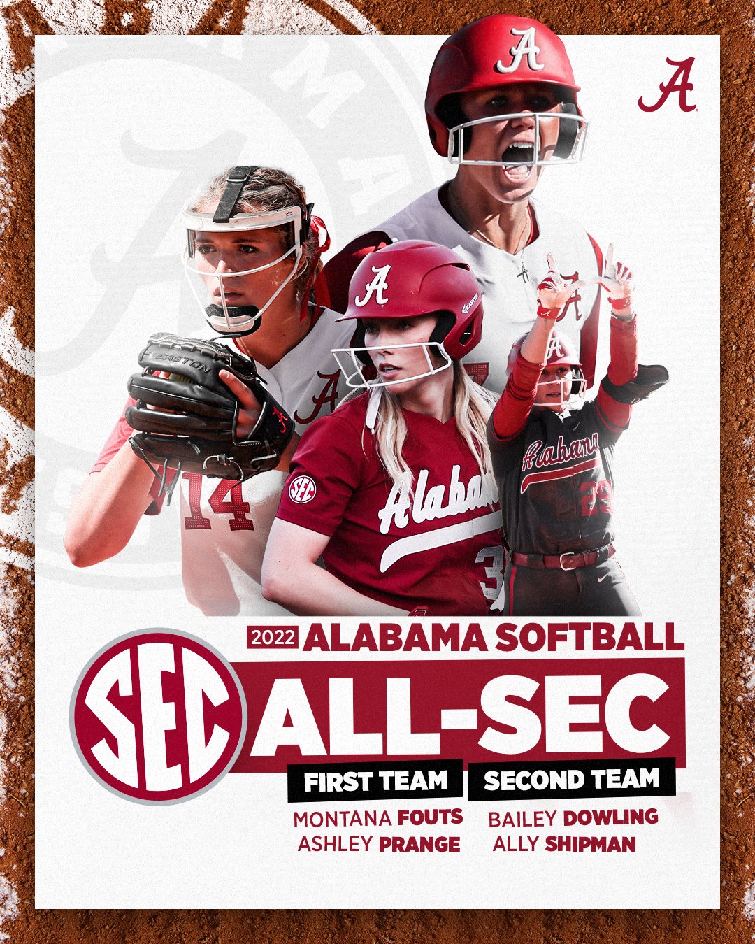 Alabama softball was well-represented in the SEC all-conference teams announced Friday. Pitcher Montana Fouts and third baseman Ashley Prange earned first-team All-SEC honors while shortstop Bailey Dowling and catcher Ally Shipman were named to the second team.