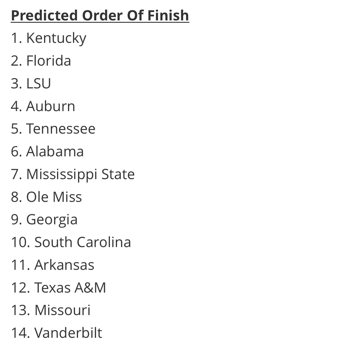 Cecil tweeted today that the pre-season SEC media poll put us 6th in the league this year. UK to win it followed by UF. The rest I don’t know.
