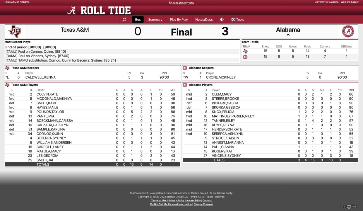 No. 6 Alabama Soccer Downs Texas A&M, 3-0