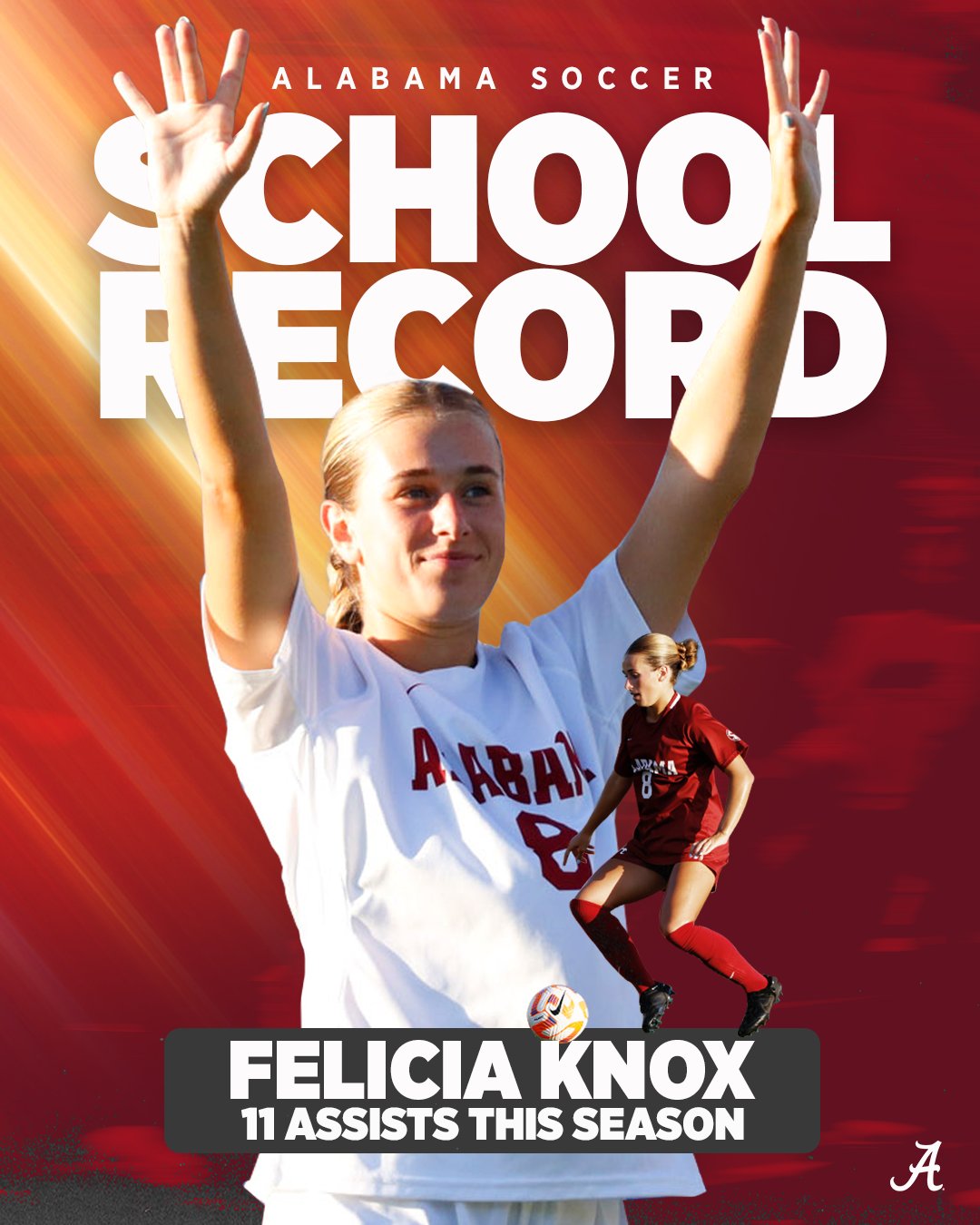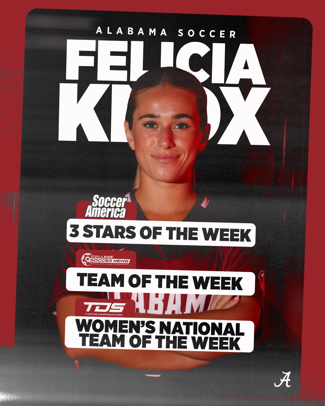 For the second-consecutive week, No. 5 Alabama soccer's Felicia Knox received a trio of national weekly honors. Knox was named to Soccer America's 3 Stars of the Week, College Soccer News' Team of the Week and TopDrawerSoccer's National Team of the Week.