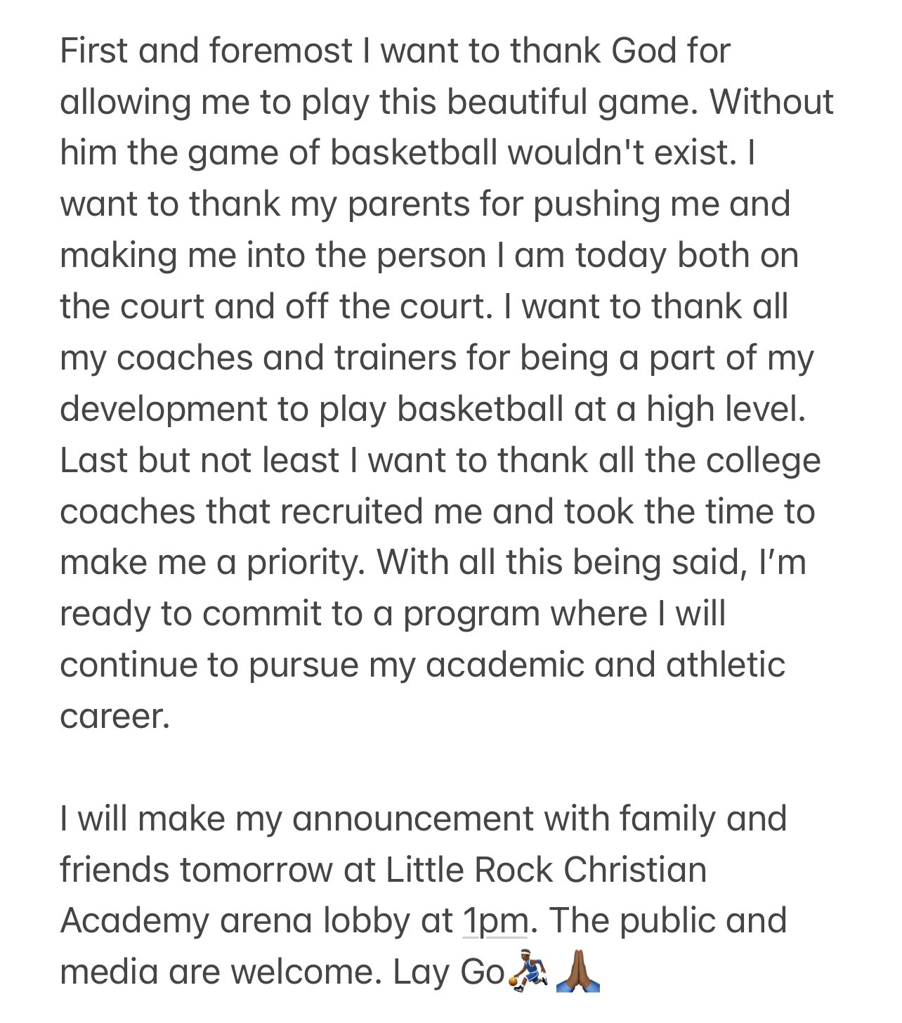 Quote from previous interview: “Arkansas has one of the best coaching staffs. What I like about them is how they play, and how hard they coach. Coach Musselman has an NBA background. I like that…Muss does a great job recruiting. He has one of my teammates, Anthony Black. He told me they like him and it’s a really good program to go to. Anthony is trying to get me to come there. I know Muss told me that when I get there, they’re going to help me reach my goal. I’m guessing they’re going to let me rock out and push me to be the best me. That’s what I need.”