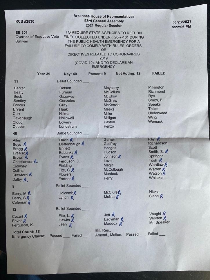 No problem, though, because in Arkansas, only a simple majority in the House and Senate is needed to overrule a gubernatorial veto.
