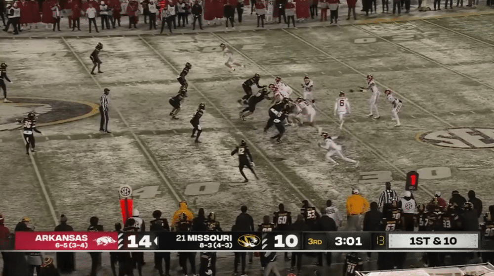 Arkansas turned the ball over twice — both fumbles — at a snowy Faurot Field in Columbia, Missouri, and both of those directly led to Missouri touchdowns.