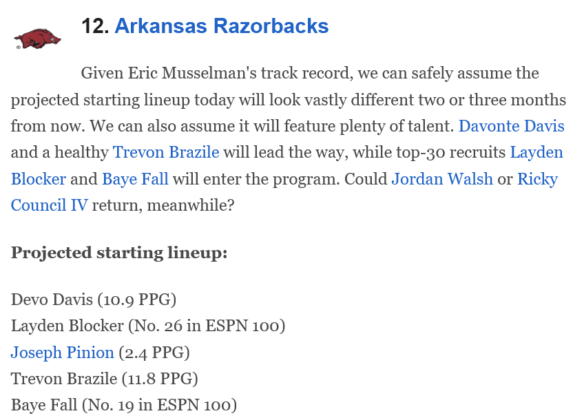 ESPN's CBB Way Too Early Top 25: #12 Arkansas