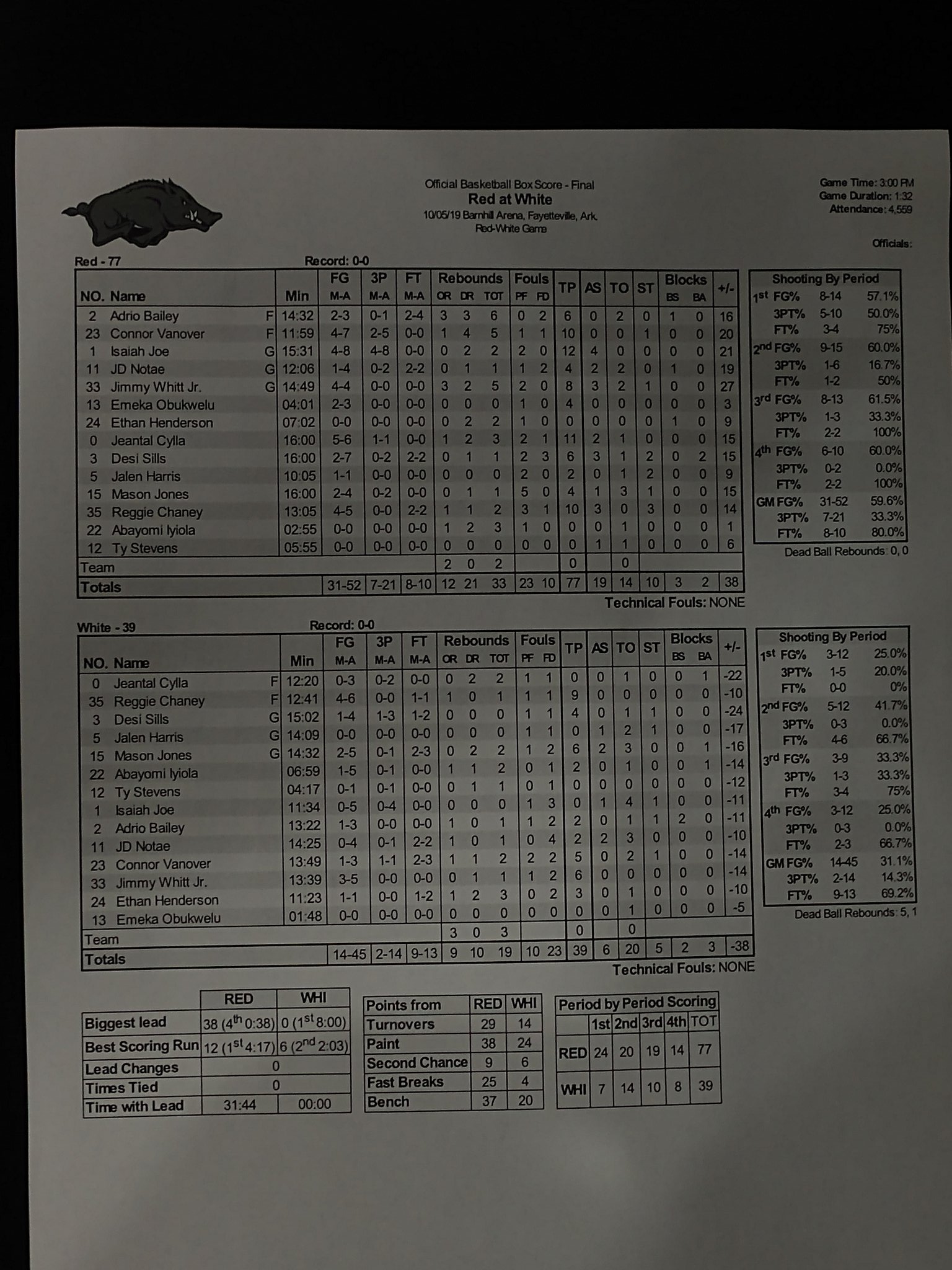 FINAL PLAYER POINTS-REBOUNDS RED (White 2nd half) Connor Vanover 15 pts – 7 reb Jimmy Whitt Jr. 16 pts – 6 reb Isaiah Joe 12 pts – 2 reb (5 assists) Adrio Bailey 8 pts – 7 reb JD Notae 6 pts – 2 reb Emeka Obukwelu 4 pts – 0 reb Ethan Henderson 3 pts – 5 reb