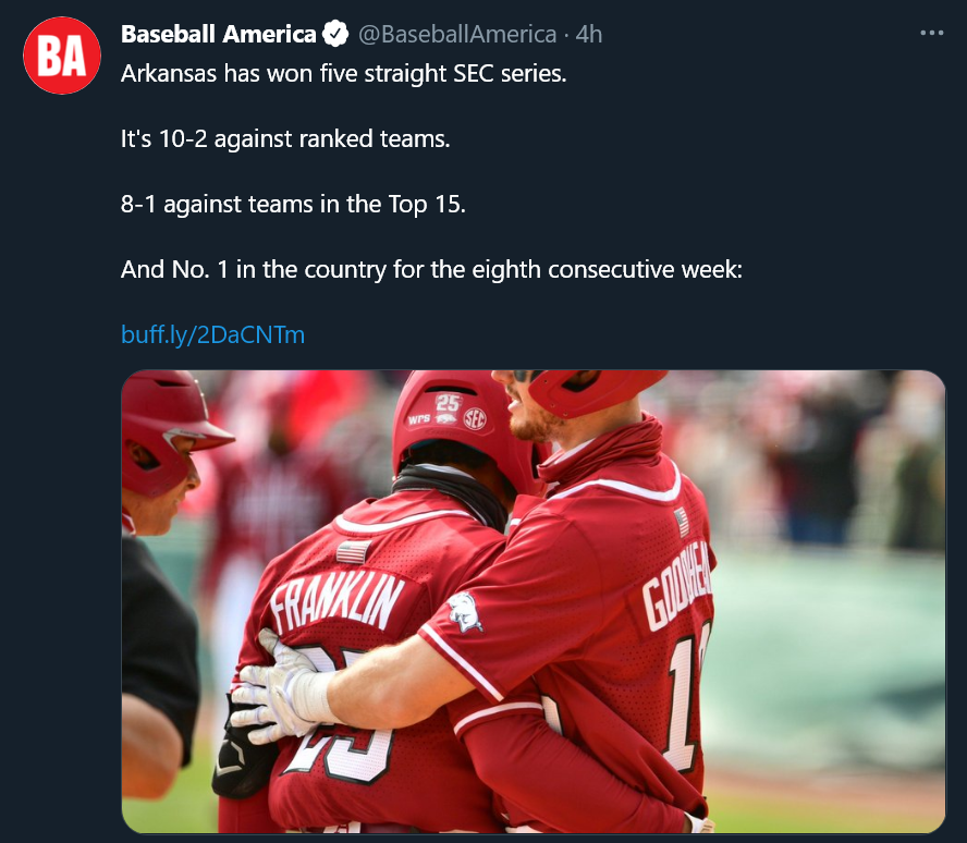Comes as no surprise, but Arkansas holds at #1 again this week in all polls released so far.
