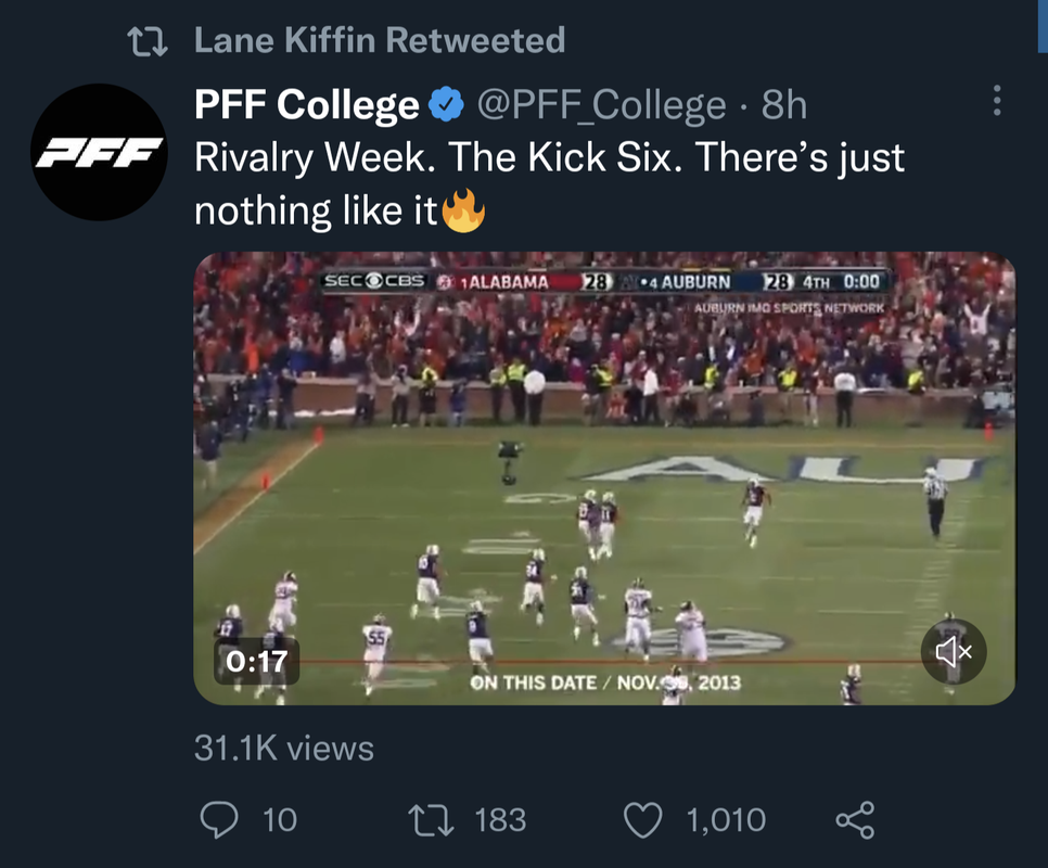 Kiffin just tweeted out a video of the Kick Six.