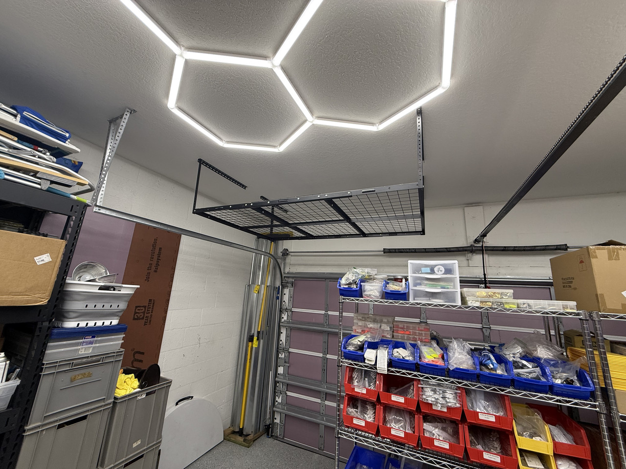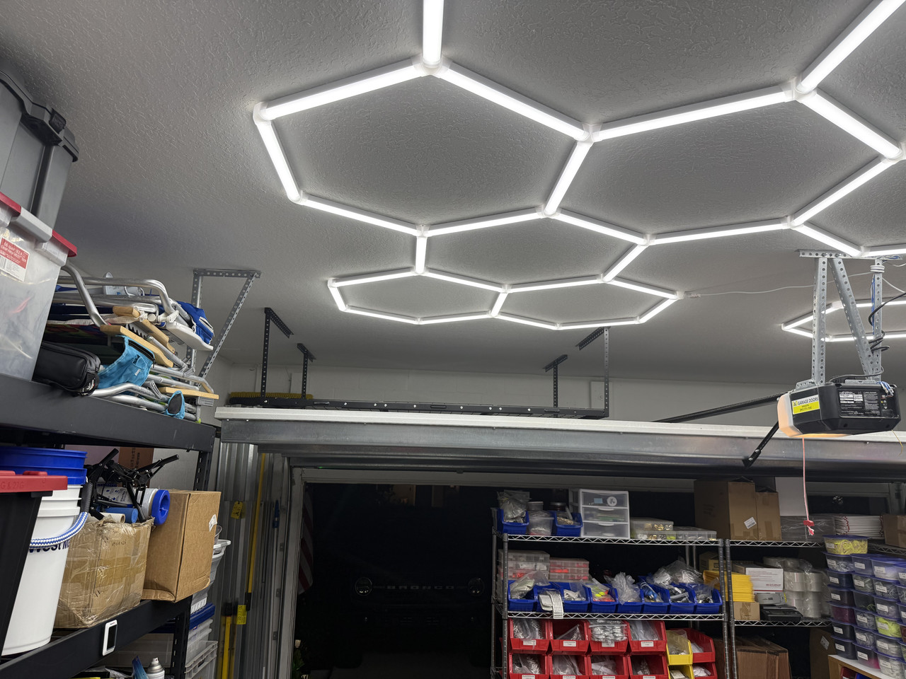 I am not sure what you are doing in your garage or how big it is but man you dont need many of these. I would think a 5 hex kit would be enough for most applications. I put one hex up today and plugged it in and the amount of light was incredible. I went with the bigger brighter kit because I need the light to tie jigs and paint; I do a good bit of detail work with artist pens and my eyes are not what they once was.