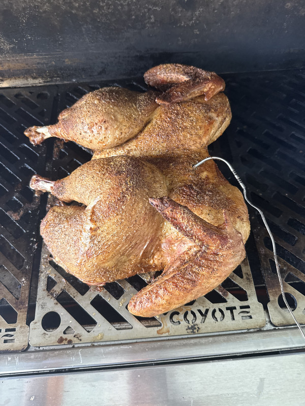 Morning bro. We had our thanksgiving dinner last Friday with friends. Steaks today. I have tried to smoke a whole turkey a few times and they came out OK but now I just do the spatchcock thing. Its easy and comes out great. I did it last Friday. Did not brine. Just dried it off, trimmed up the excess after removing the spine. Used Mayo then cajun seasoning. Smoked for about 3 hours or so till internal was 160 basting about every 45 mis with butter. Took it off and put it in a cooler wrapped for about 2 hours till dinner time. Came out great and was pretty fool proof....