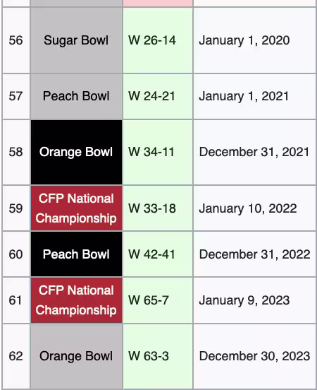 That is an impressive record. Georgia and Ohio State have been on a similar path this decade, beating everyone but one rival who has given them a challenge. I'd put you guys at #1 with us at #2. We're 64-5 but 0-4 vs the Wolverines.