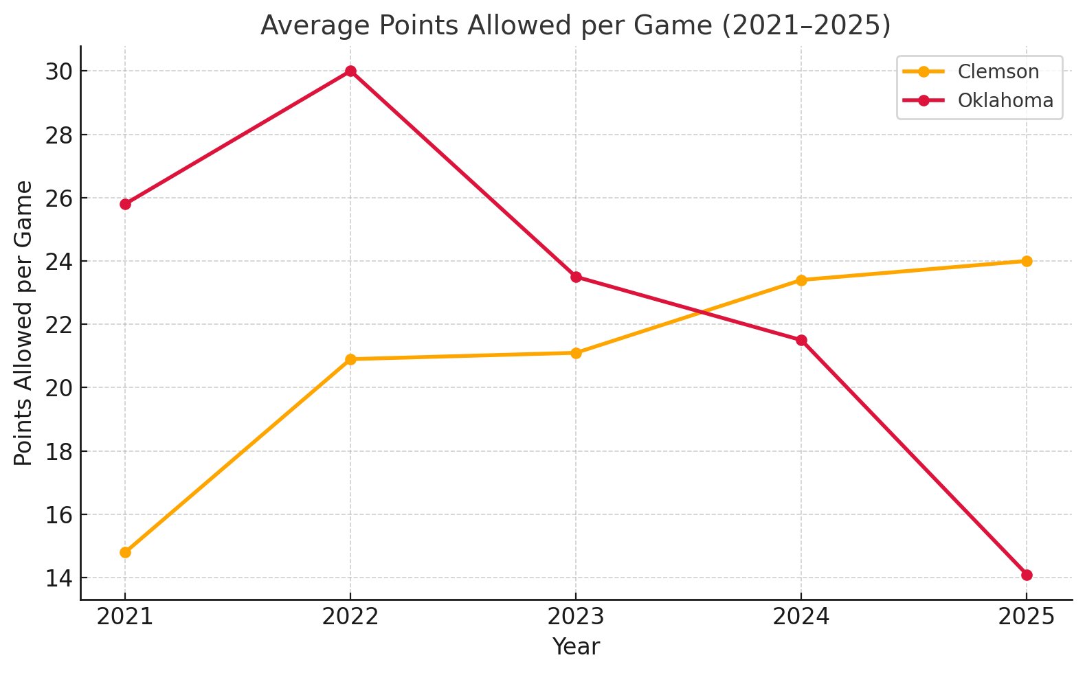 Oklahoma and Clemson points allowed per game, starting with the year before Brent Venables became the HC at Oklahoma: